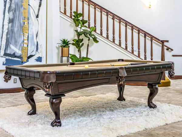 The Kruger billiard table is a traditional pool table with a beautiful, dark brown finish. The African wood is finished in a luxurious dark chocolate and has a choice of two leg styles: Tapered or Ball & Claw.